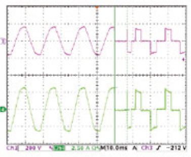 图2为桥式整流的典型线路。在RLC模式下,用户可透过设定RLC值,100%模拟实际待测物的行为。图3&4分别是透过实际被动负载(电阻、电感、电容)与使用RLC负载模式量测。图5则为定电流模式下所得到的波形。