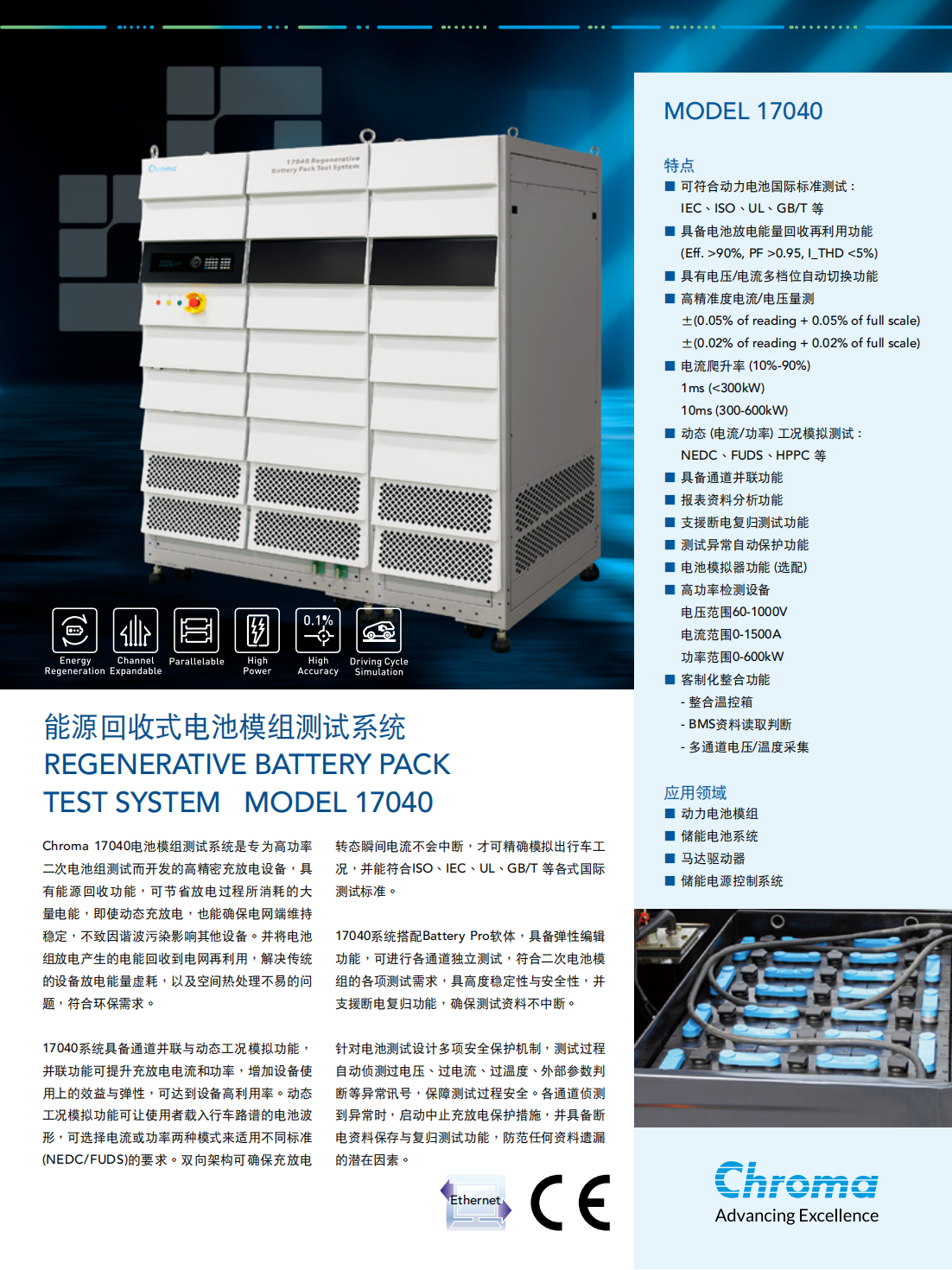 Chroma 17040电池模组测试系统是专为高功率二次电池组测试而开发的高精密充放电设备,具有能源回收功能,可节省放电过程所消耗的大量电能,即使动态充放电,也能确保电网端维持稳定,不致因谐波污染影响其他设备。