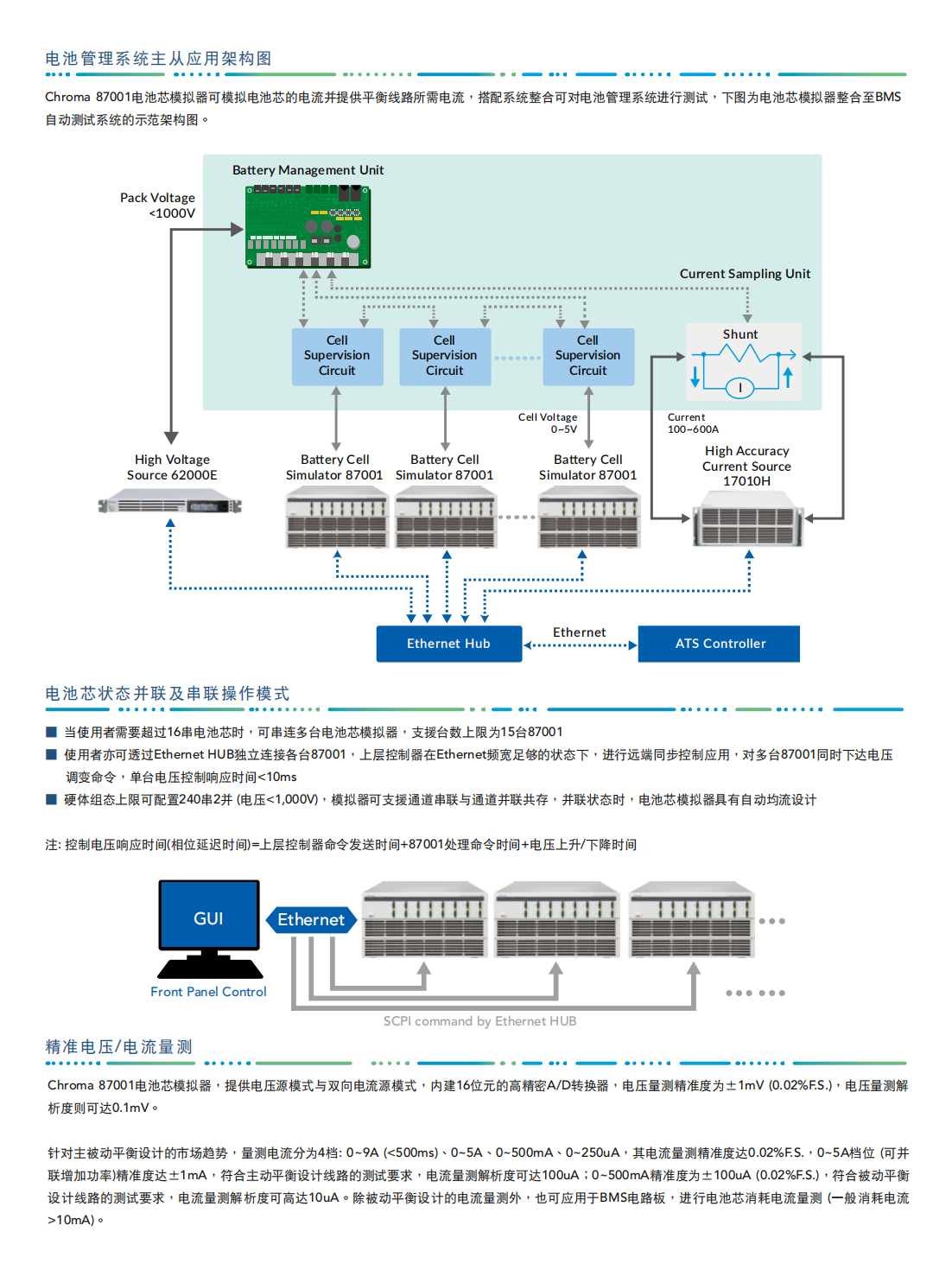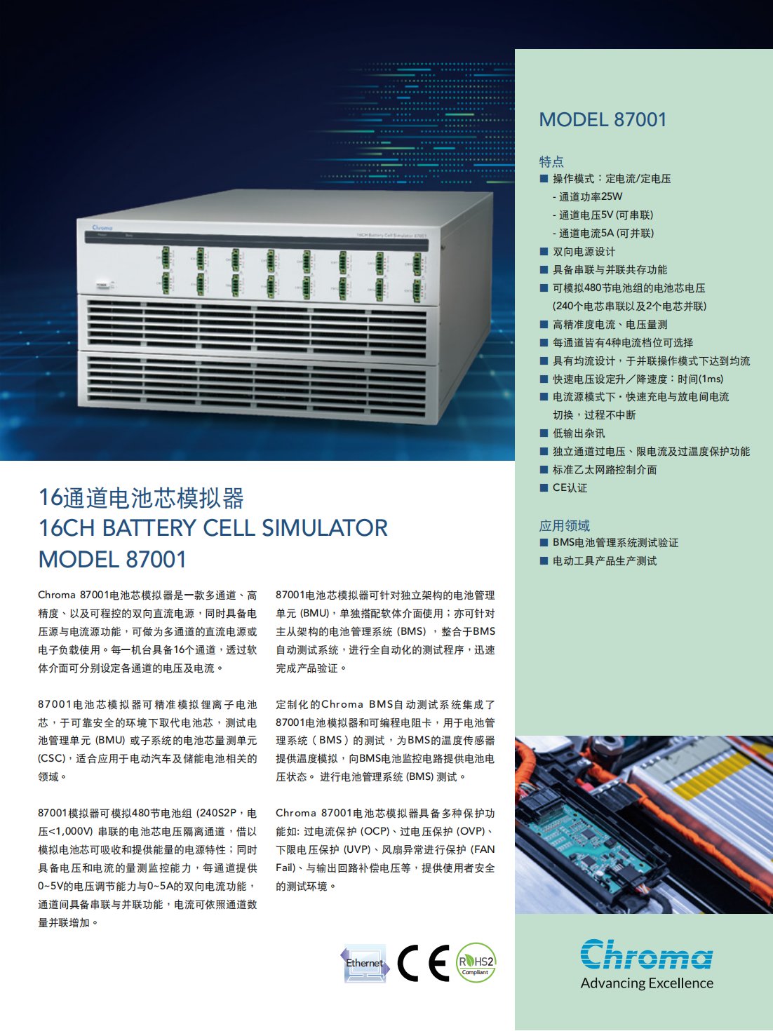 Chroma 87001电池芯模拟器是一款多通道、高精度、以及可程控的双向直流电源,同时具备电压源与电流源功能,可做为多通道的直流电源或电子负载使用。