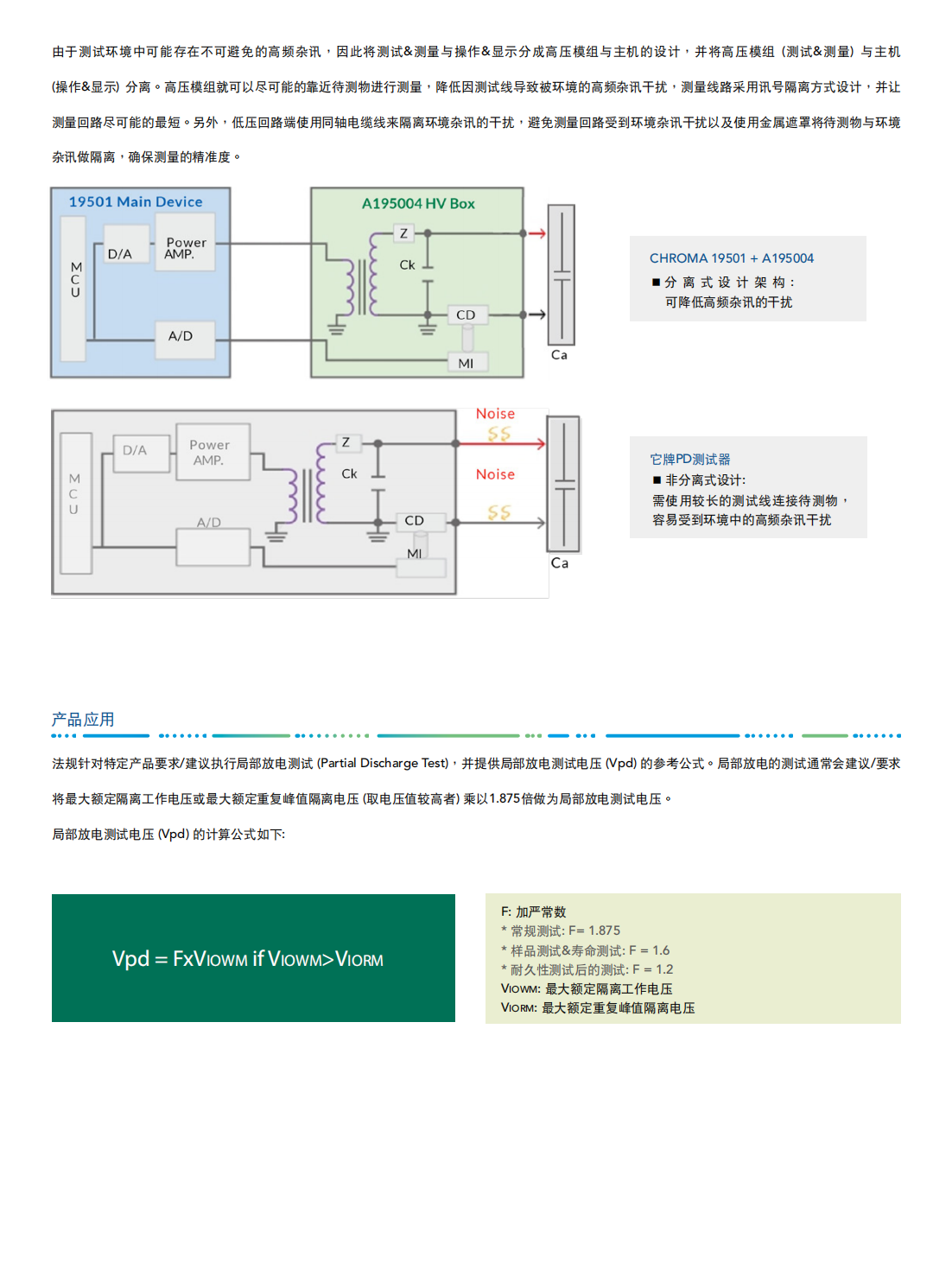 Chroma 19501局部放电测试器可提供交流耐电压测试(Hipot Test)测量待测物上的漏电(Leakage Current)与电气闪络(Flashover),以及提供局部放电(Partial Discharge,PD)测量待测物上局部放电的电荷量(pC)对高压元件与高耐压的绝缘材料进行交流耐电压与局部放电测试,可确保产品的绝缘品质与提升产品的可靠度。